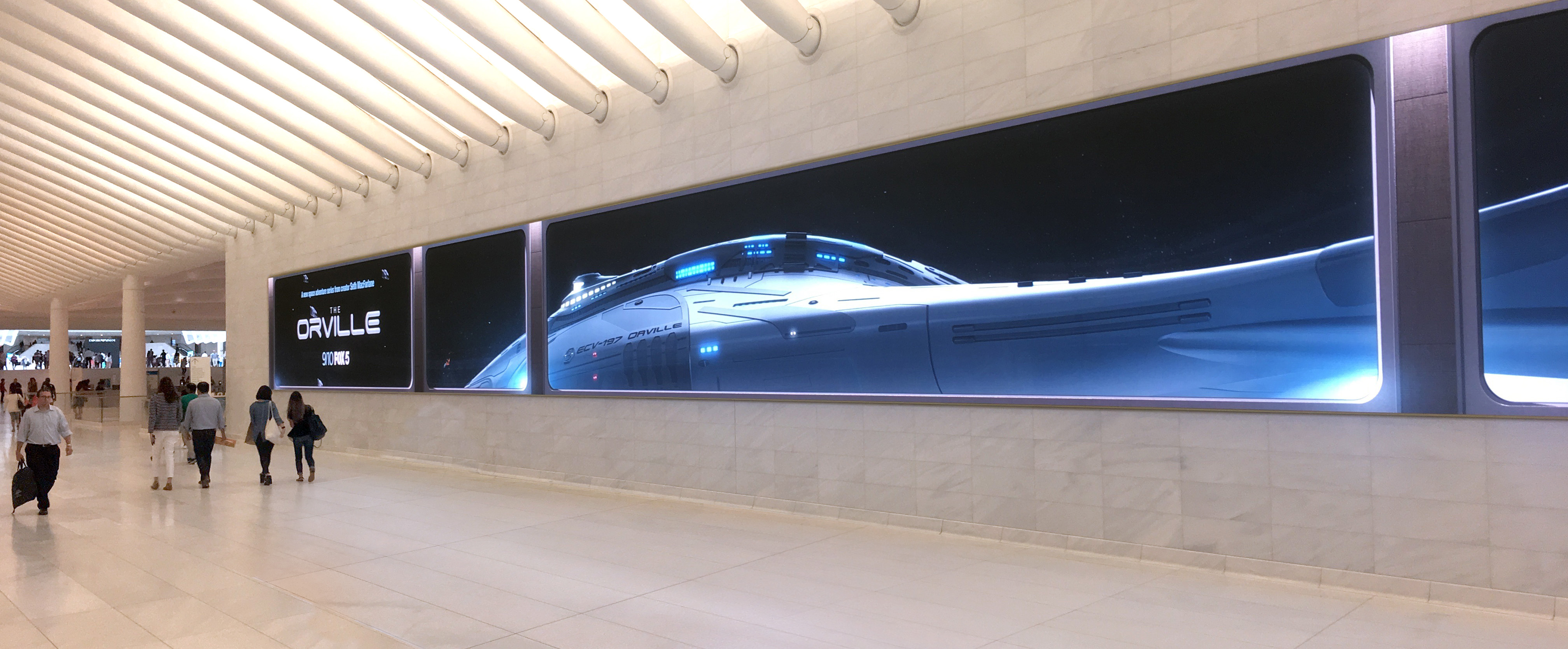 For this Out-Of-Home placement we used the massive digital screens of New York’s World Trade Center to full effect. Our concept was simple: transform the WTC into a futuristic space station orbiting earth. By spreading a single piece of creative across multiple “observation window” screens we gave millions of commuters a 1:1 scale view of the world of The Orville. The hero of the piece is the titular Starship Orville, rendered to scale on the venue’s showpiece 300+ foot LED screen.